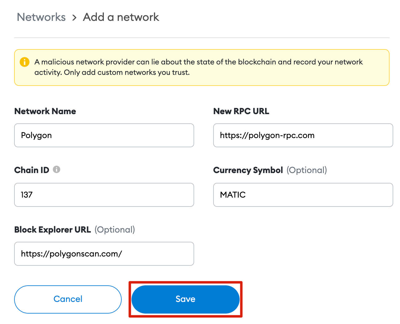 After adding Polygon Network into MetaMask, click “**Save**“.